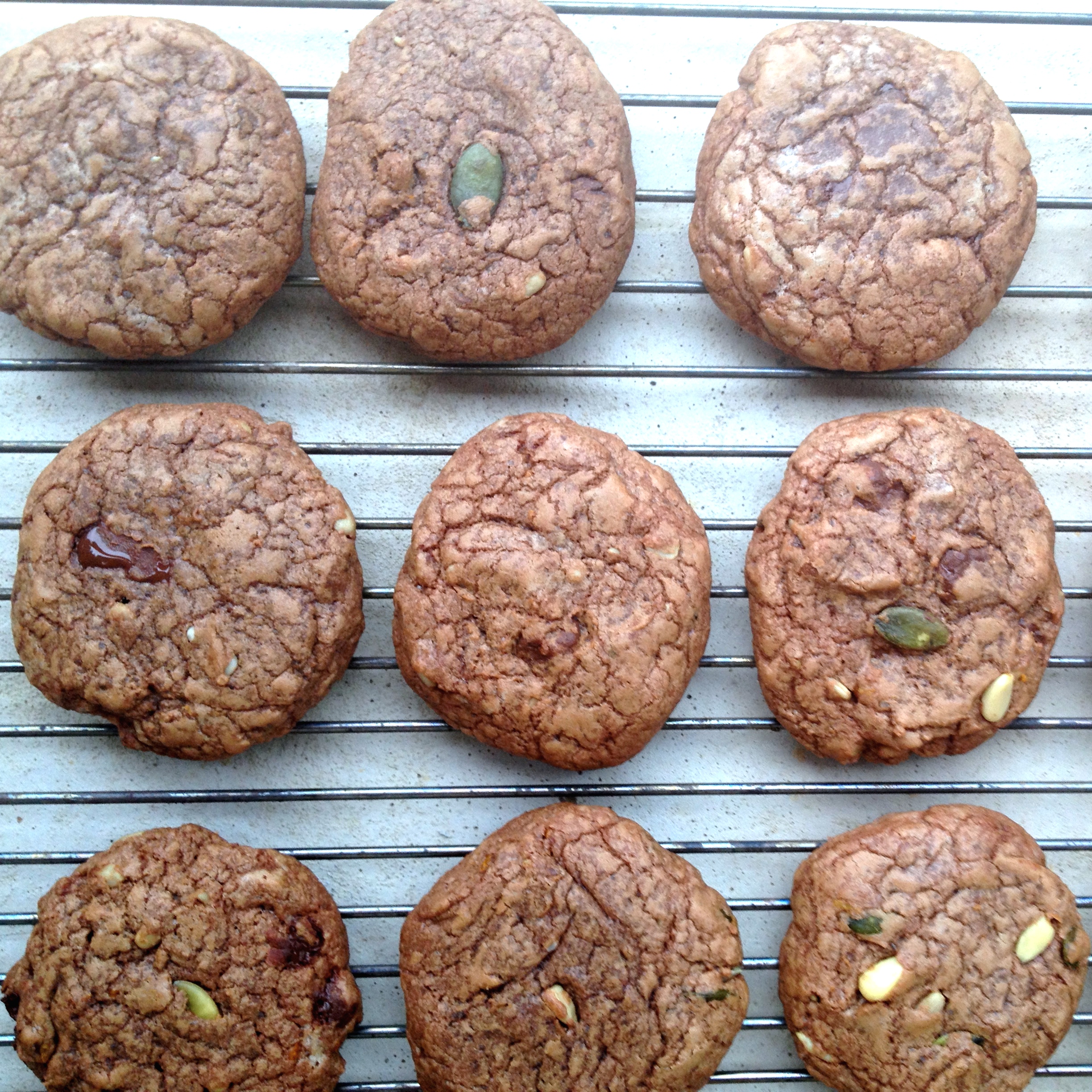 Mélangez le beurre fondu et les sucres dans un bol. Ajoutez ensuite les oeufs entiers et mélangez à nouveau avant d’y intégrer le reste des ingrédients : farine, sel, pépites de chocolat, le zeste d’une orange et les graines.