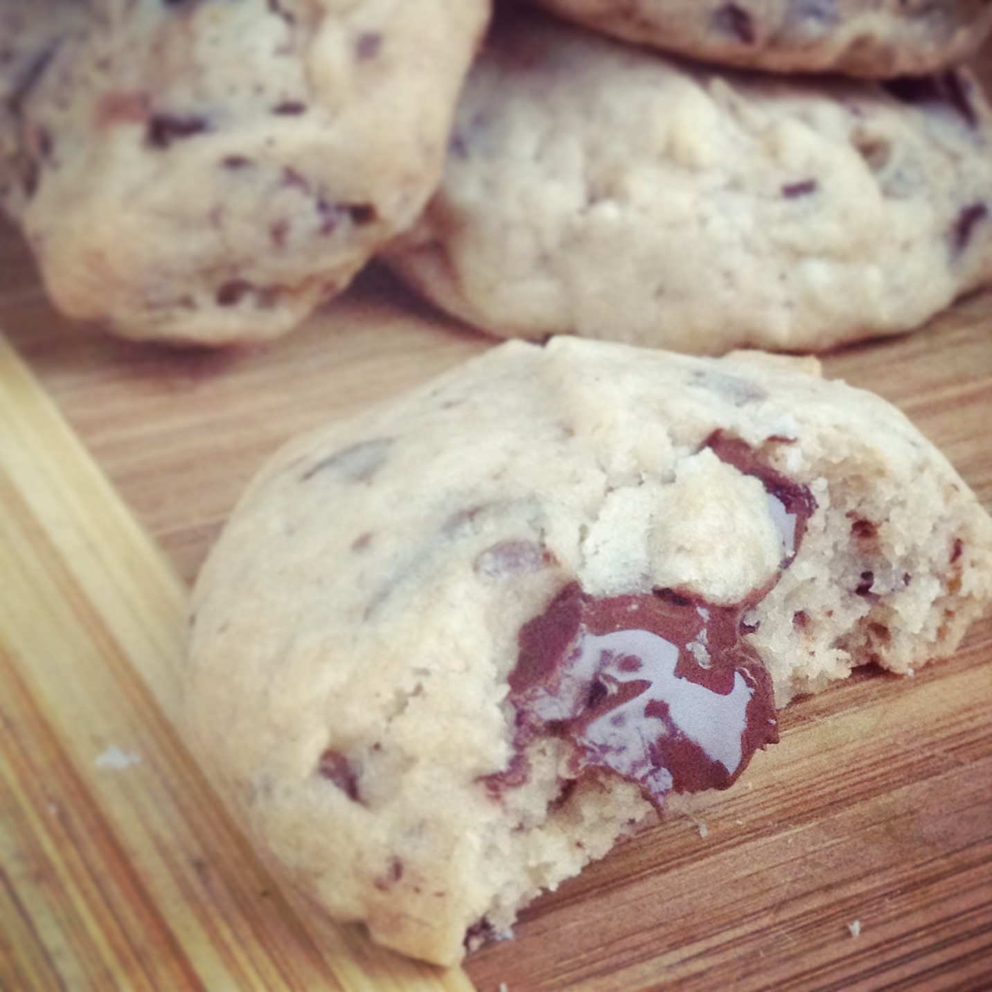 Vous l’aurez remarquer il y a deux sortes de biscuits aujourd’hui avec une seule et même recette. La raison est très simple. Pour la première fournée, impatiente et excitée, je n’ai pas laissé reposer la pâte, et j’ai vite remarqué que les biscuits n’allaient pas prendre. Je les ai retiré du four après quelques minutes, mais les pépites ayant commencées à fondre donneront une charmante couleur brune à l’ensemble une fois re-mélangé. Comme quoi, c’est beau de se tromper.