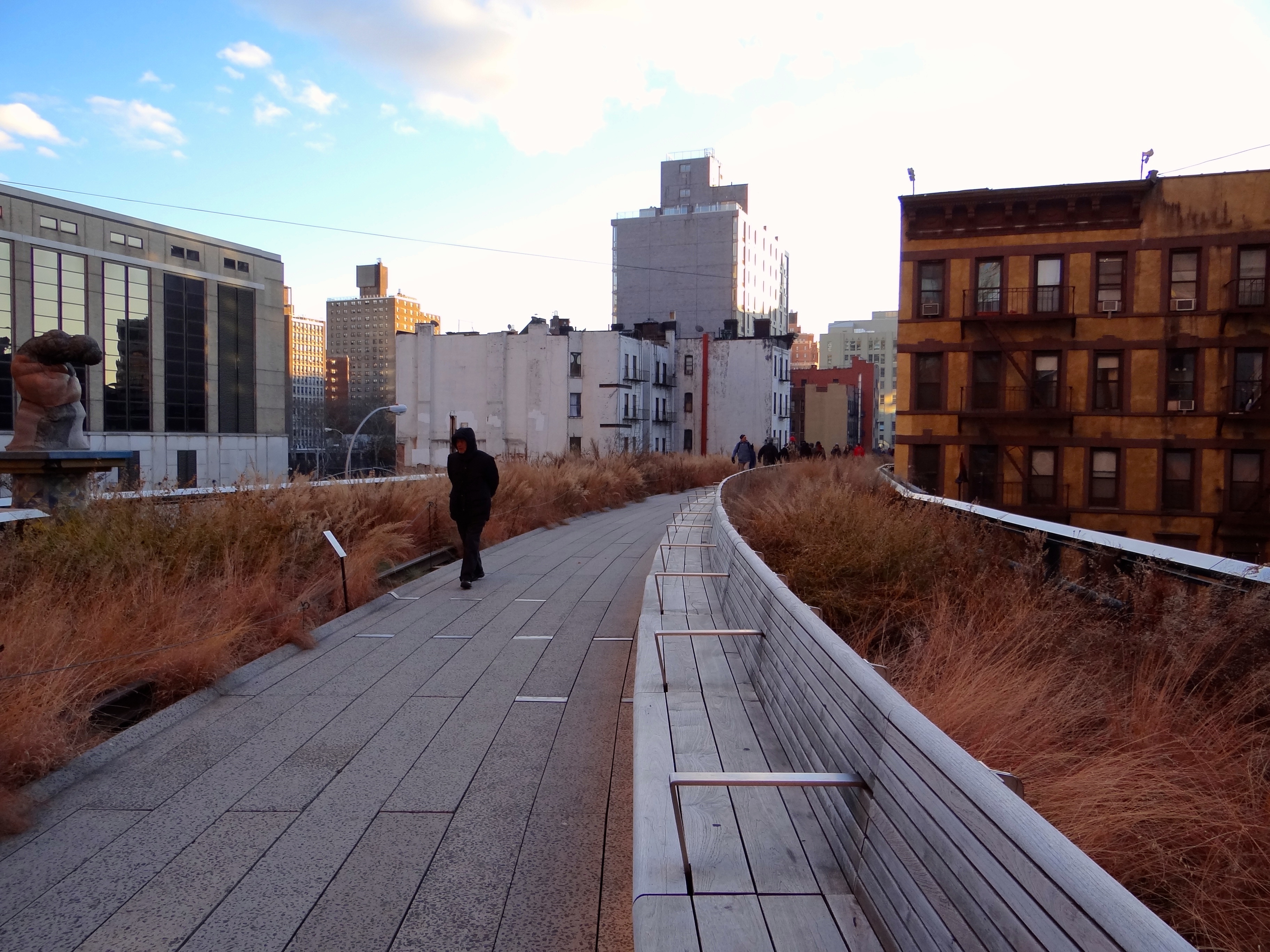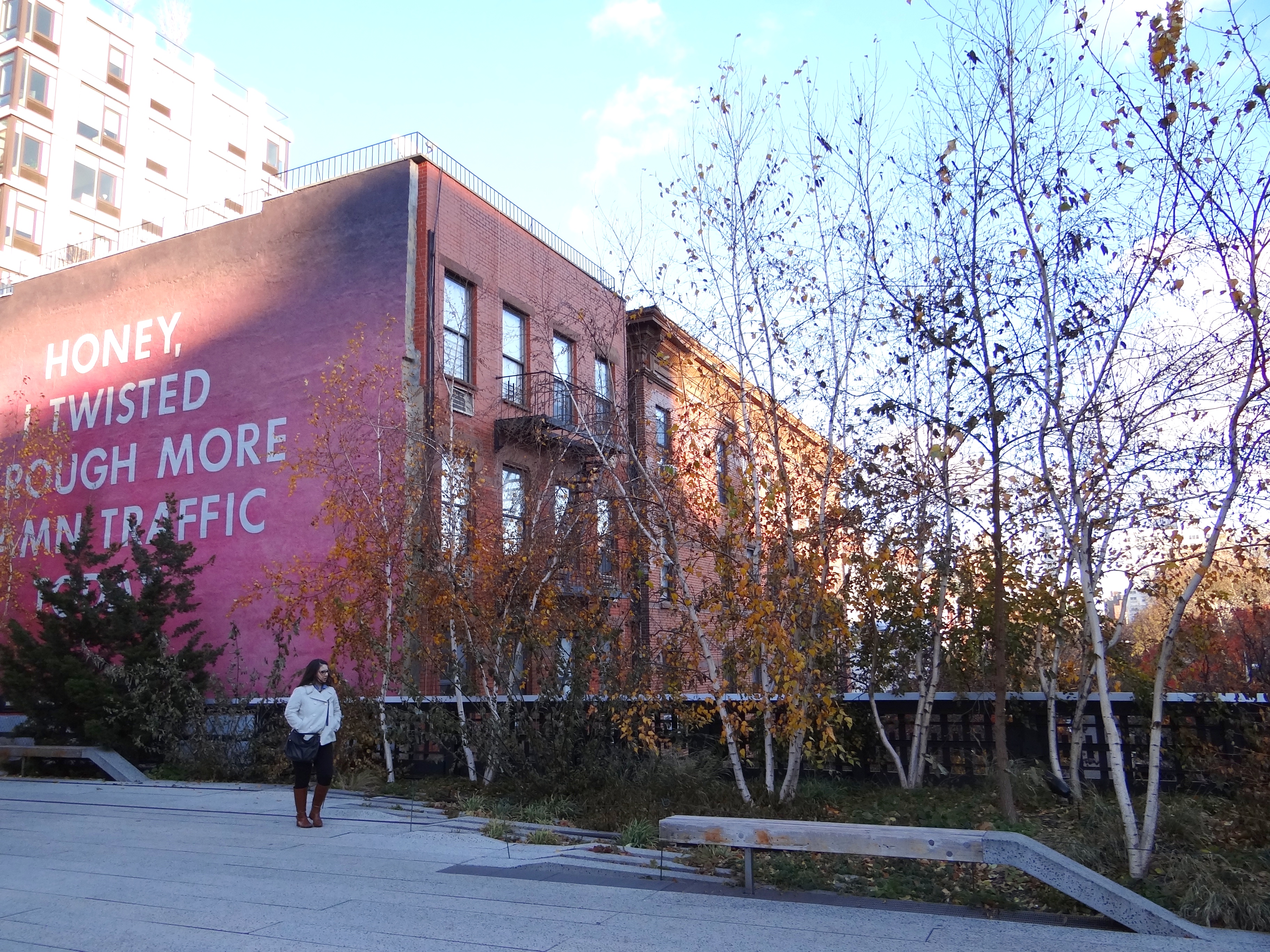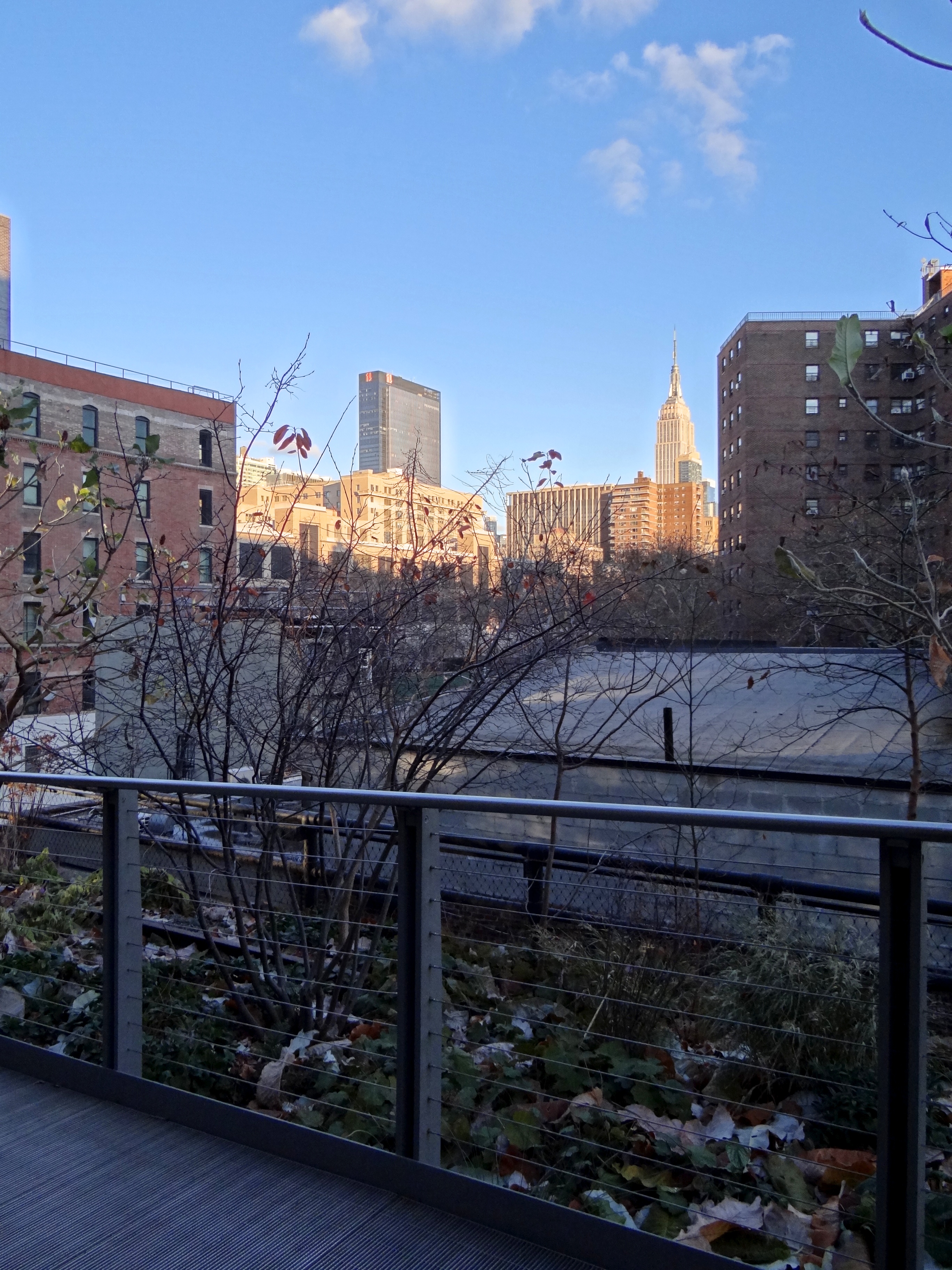 Si tes petits petons sont encore flexibles, c’est le moment de pousser à l’Ouest vers la High Line. J’avais raté cette promenade les deux premières fois et il était hors de question que j’y échappe cette fois-ci. La High Line est comme une voie de chemin de fer suspendue dans les airs et traversant une dizaine de bloc à l’ouest de Manhattan. La légende raconte qu’en été, c’est une vraie bouffée d’air frais et de verdure. En automne, c’est une vraie bouffée d’air frais ! Mieux vaut être bien couvert, mais la balade reste agréable et calme, tout en offrant un point de vue plus « industriel » de Manhattan et une jolie vue sur l’Empire State.