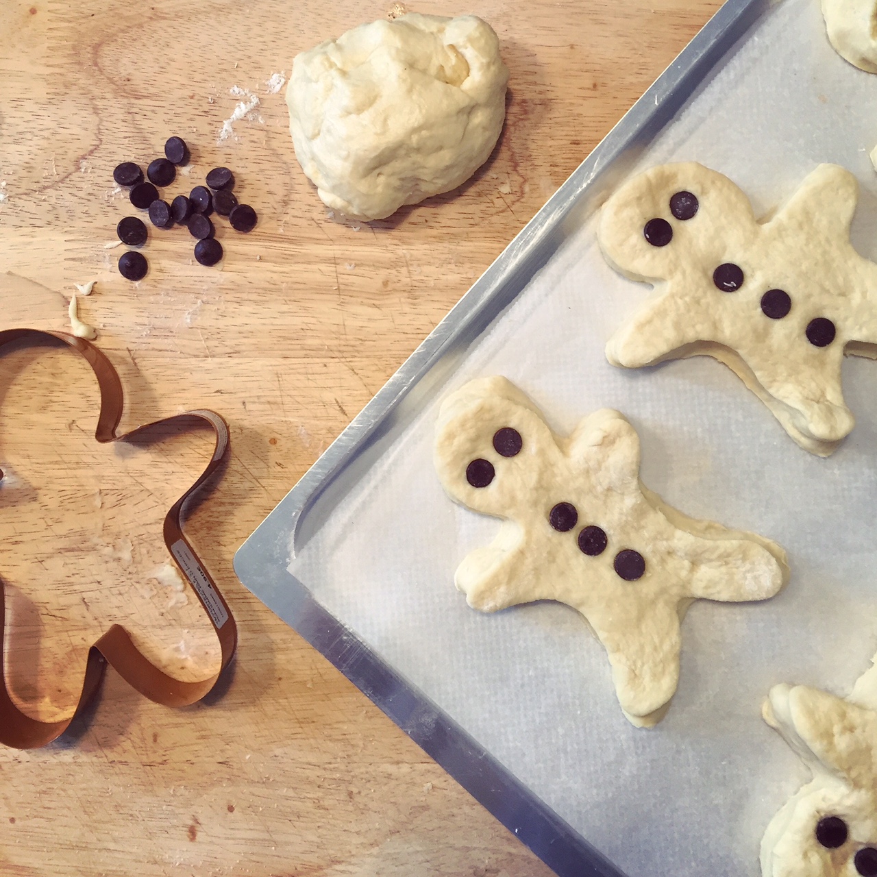 Le lendemain, Saupoudrez votre plan de travail de farine, y déposer la boule de pâte que vous pouvez étaler un peu à l’aide d’un rouleau. Découpez des bonhommes avec un emporte-pièce ou en formant des petites boules puis des boudins, à assembler entre eux ! Bon tu te débrouilles ça doit être joli !