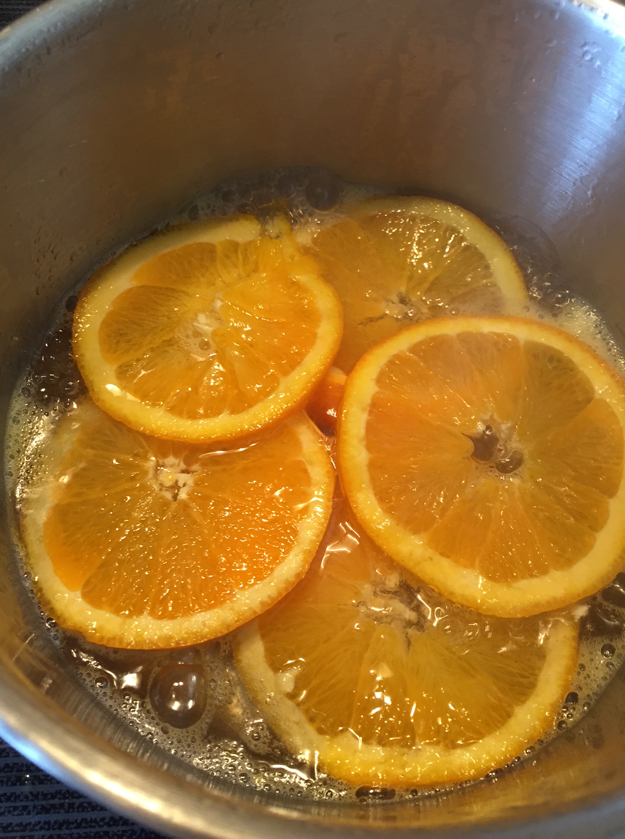Quand le sirop commence à bouillir, verser les rondelles d’orange et laisser confire pendant une dizaine de minutes.