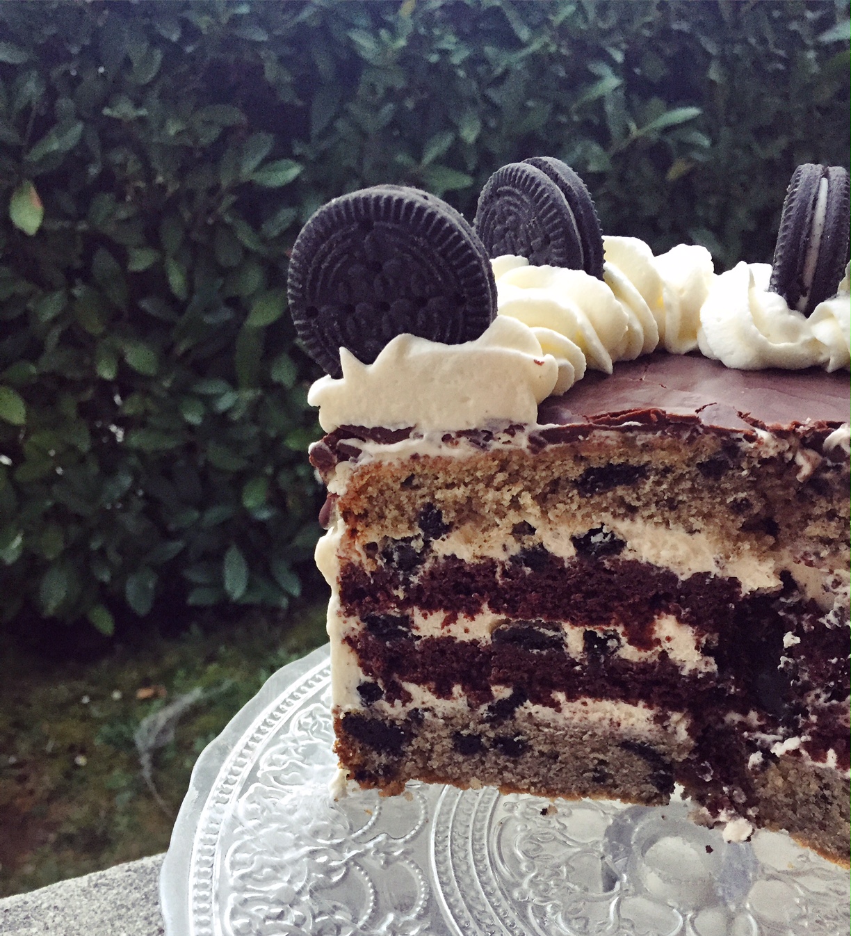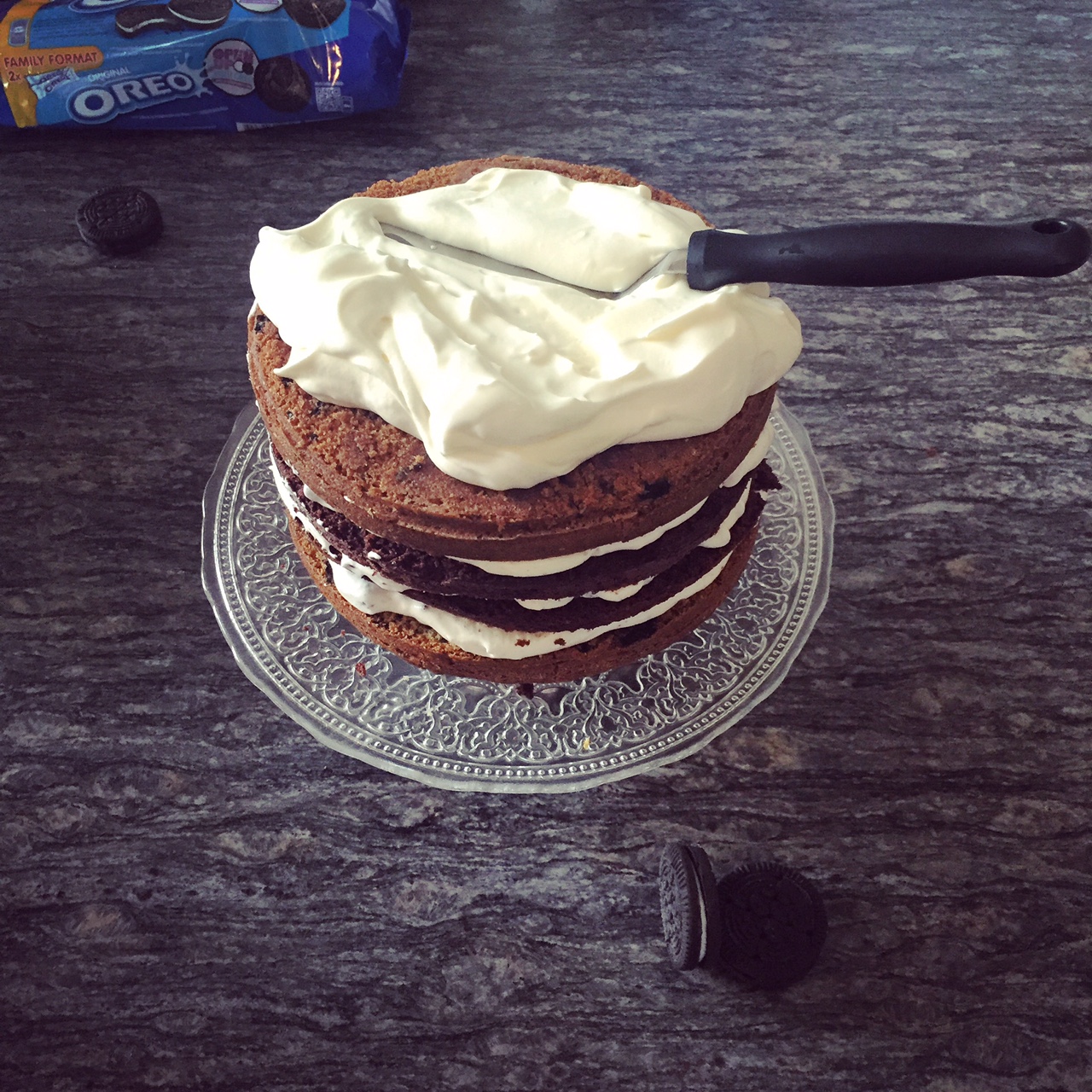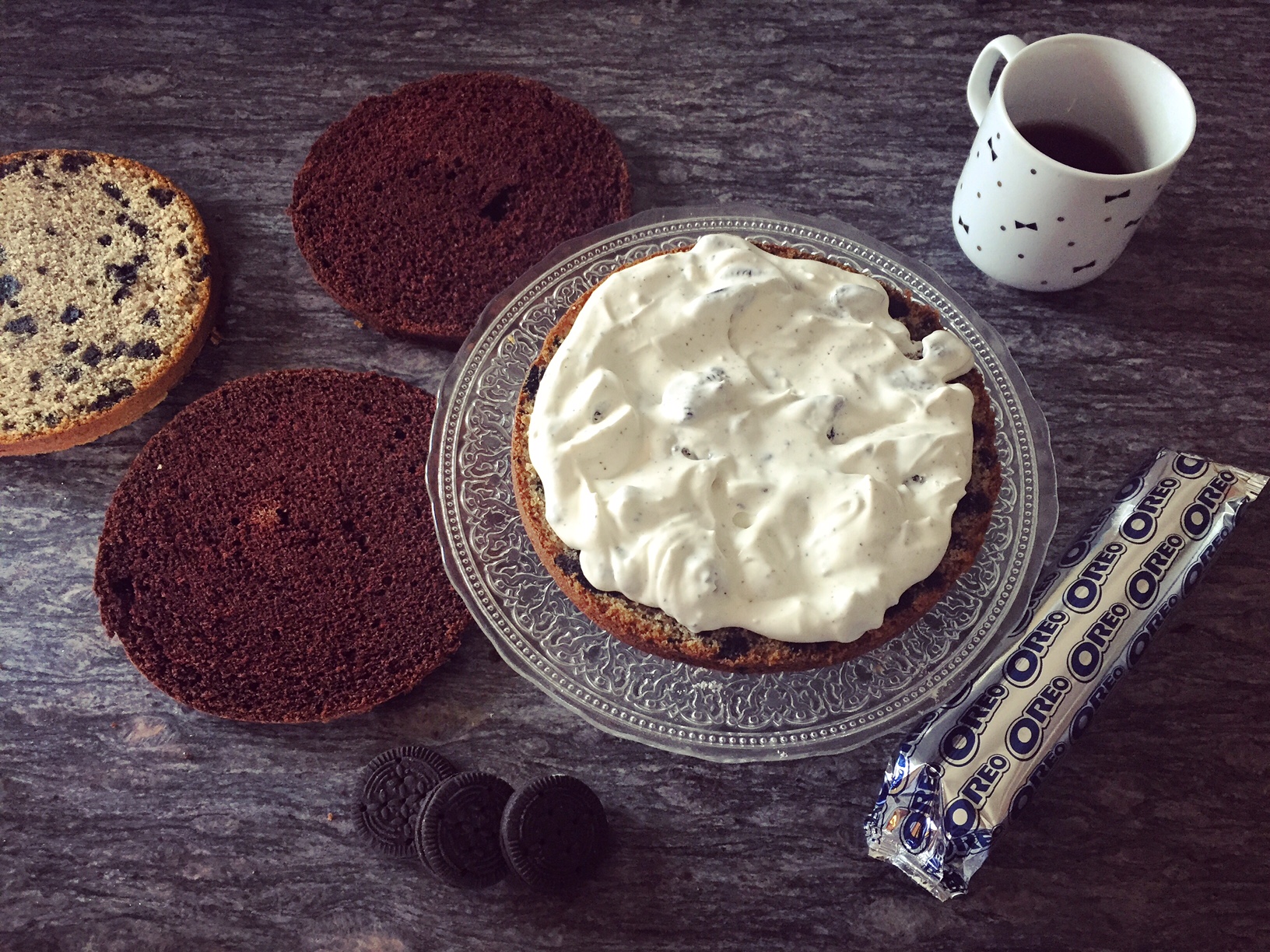 Rien de bien compliqué, deux génoises, l’une au cacao et l’autre aux oréos, garnies de cream cheese aux oréos, et recouvert de chantilly. La difficulté de la mission, c’est le « glaçage » à la chantilly, très crémeux et donc difficile de recouvrir de manière parfaitement homogène.