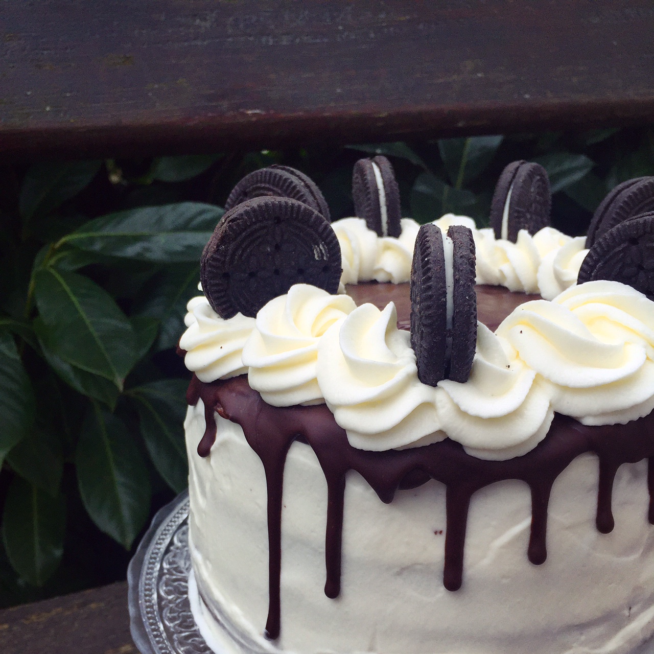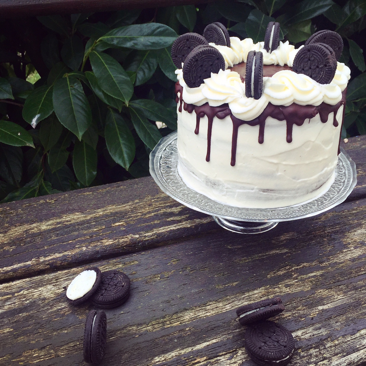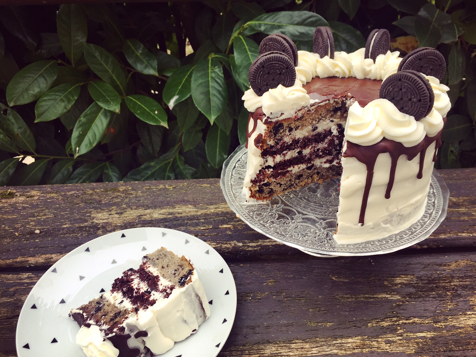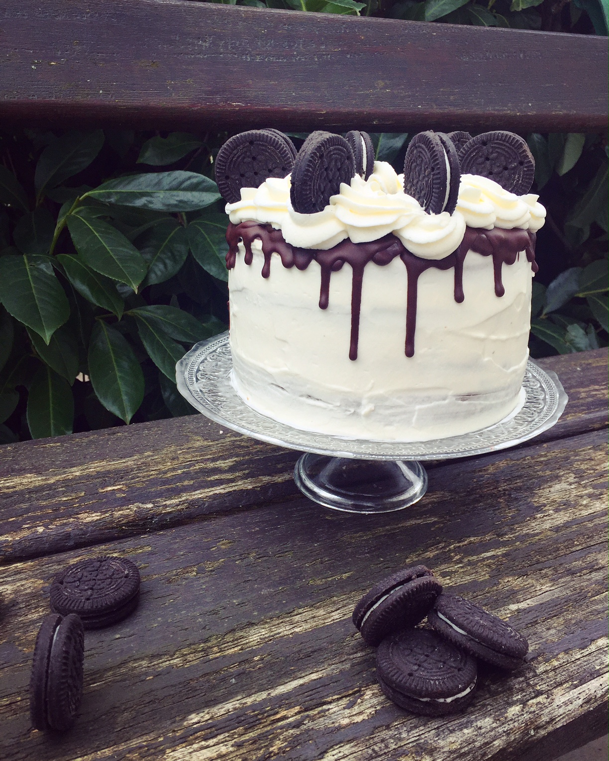 Rien de bien compliqué, deux génoises, l’une au cacao et l’autre aux oréos, garnies de cream cheese aux oréos, et recouvert de chantilly. La difficulté de la mission, c’est le « glaçage » à la chantilly, très crémeux et donc difficile de recouvrir de manière parfaitement homogène.
