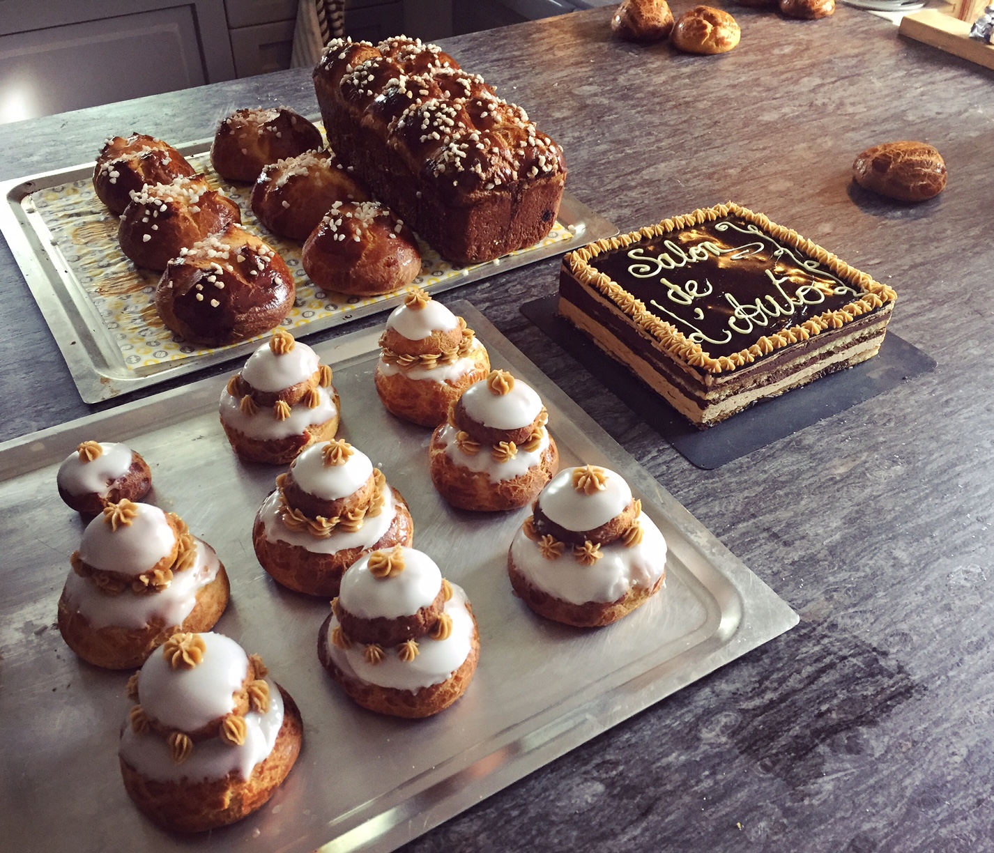 S’en suivent alors quelques semaines d’entrainement intensif. Plus je m’entraîne, plus j’ai envie d’essayer, de recommencer, de réviser. Je commence à en parler « oh mais c’est facile pour toi » FAUX, pas du tout ! Moi je ne sais pas faire la pâtisserie « traditionnelle », écrire au cornet, recouvrir mes tartes de nappage et encore moins la Viennoiserie (ma hantiiiiiise) – grosse partie du programme.