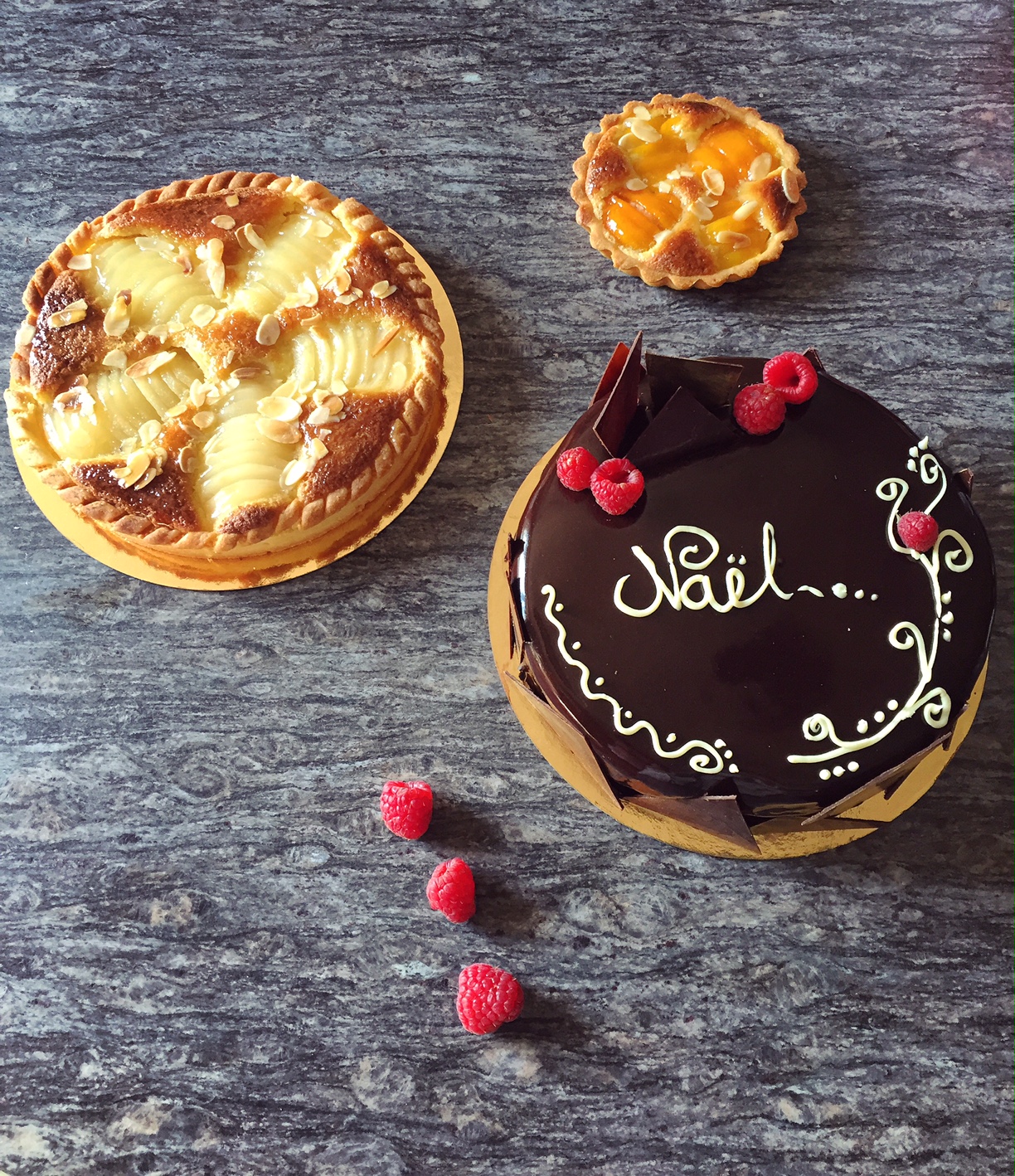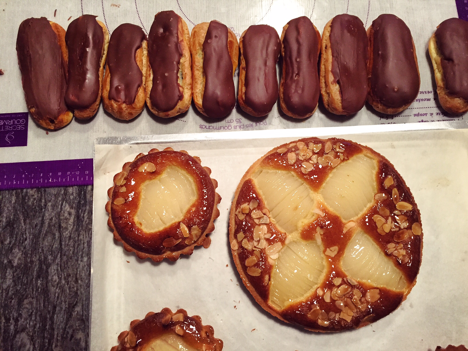 Pains aux raisins jamais fait avant le jour j ,éclairs chocolat et grué ,tarte noisette chocolat et entremet dacquoise marmelade mangue passoa et mousse au chocolat.