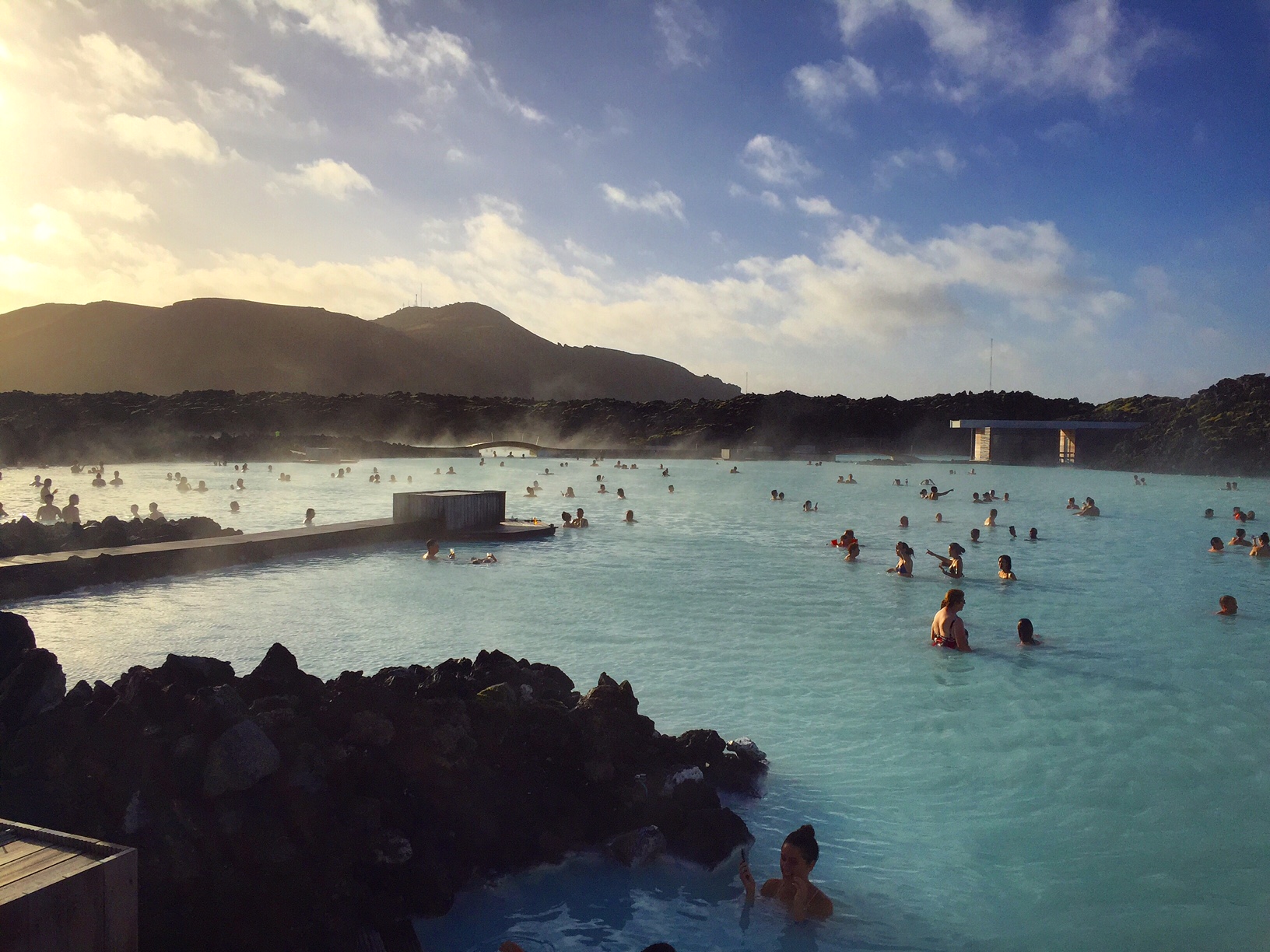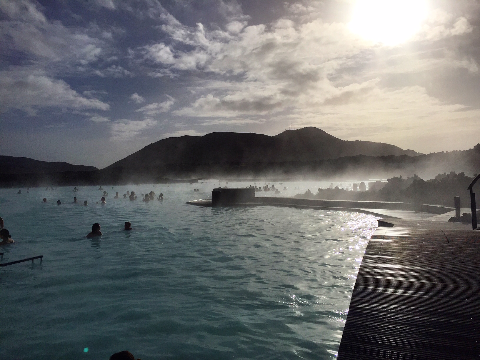 Le Blue Lagoon est donc une station thermale constituée d’un lac artificiel (je suis un peu choquée en vous l’écrivant je pensais que c’était naturel, quelle idiote !) et rempli de l’eau très chaude (39°) de la station géothermique de Svartgsengi ! Ca coûte une fortune, mais on a passé deux heures et demi à faire trempette en se recouvrant de masques aux algues, le tout au milieu des montagnes, et c’était merveilleux ! Autant vous dire que j’ai bien dormi dans l’avion hein ! Cuite de chez cuite ! (Prévoir 4h sur place en tout et s’asperger d’après-shampoing #grrr ).