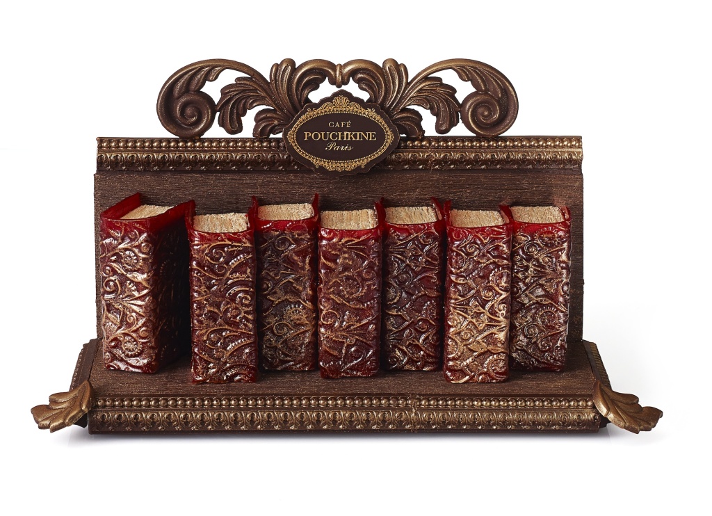 Socle en chocolat noir, biscuit fondant et crème légère au caramel fleur de sel acidulé d’un confit framboise, le tout étant enrobé par une confiture fixée et sculptée !