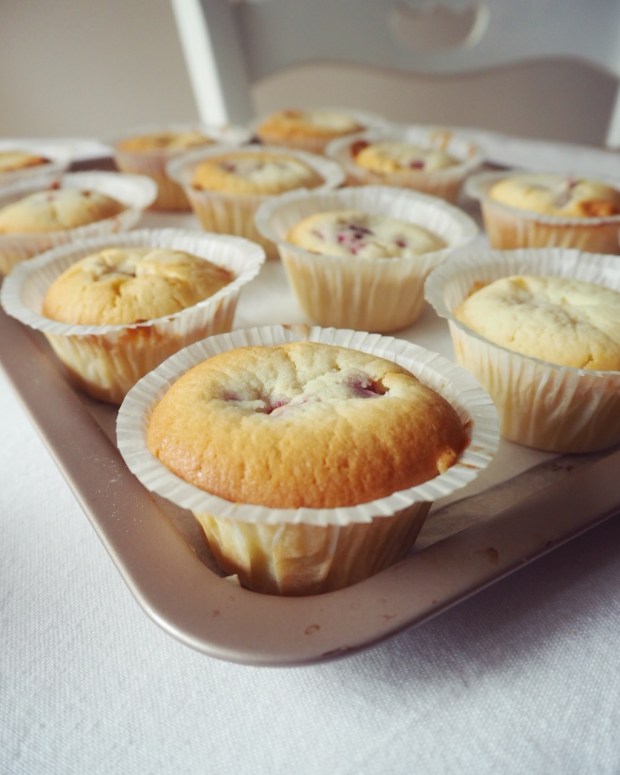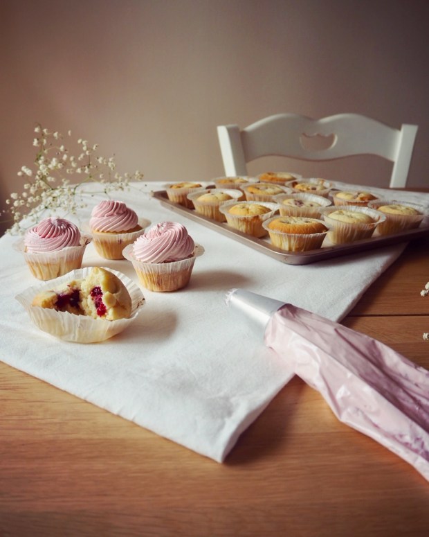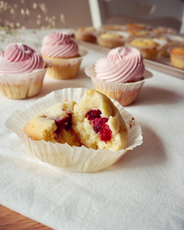 – Ajouter 3-4 framboises au centre de chaque cupcakes et enfoncer avec le doigt pour recouvrir de pâte.