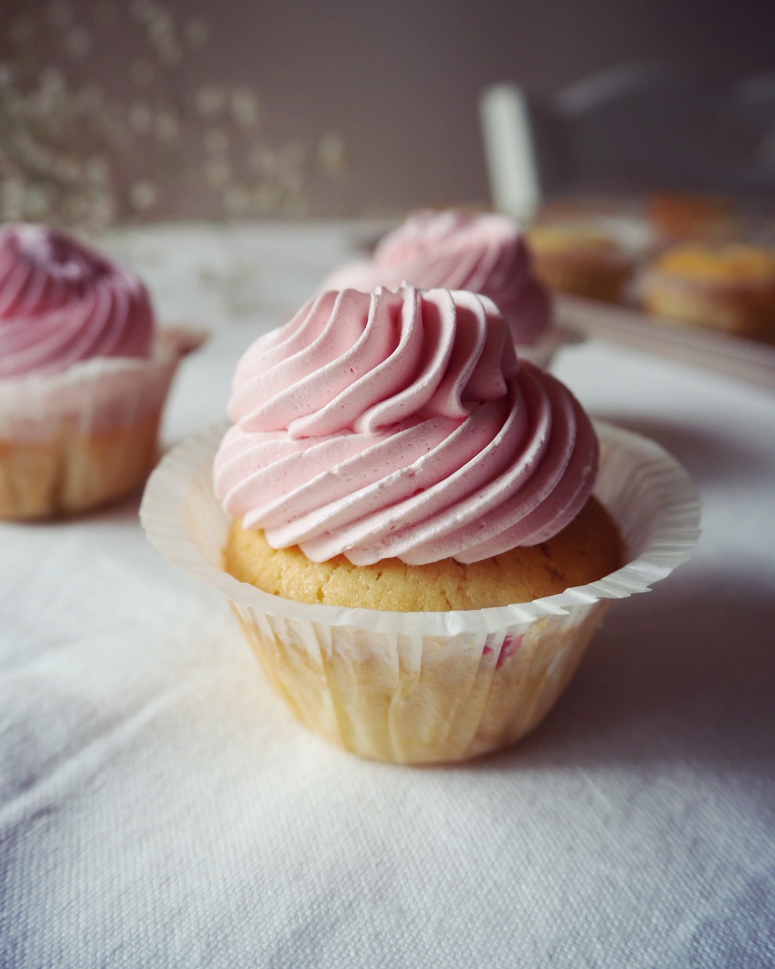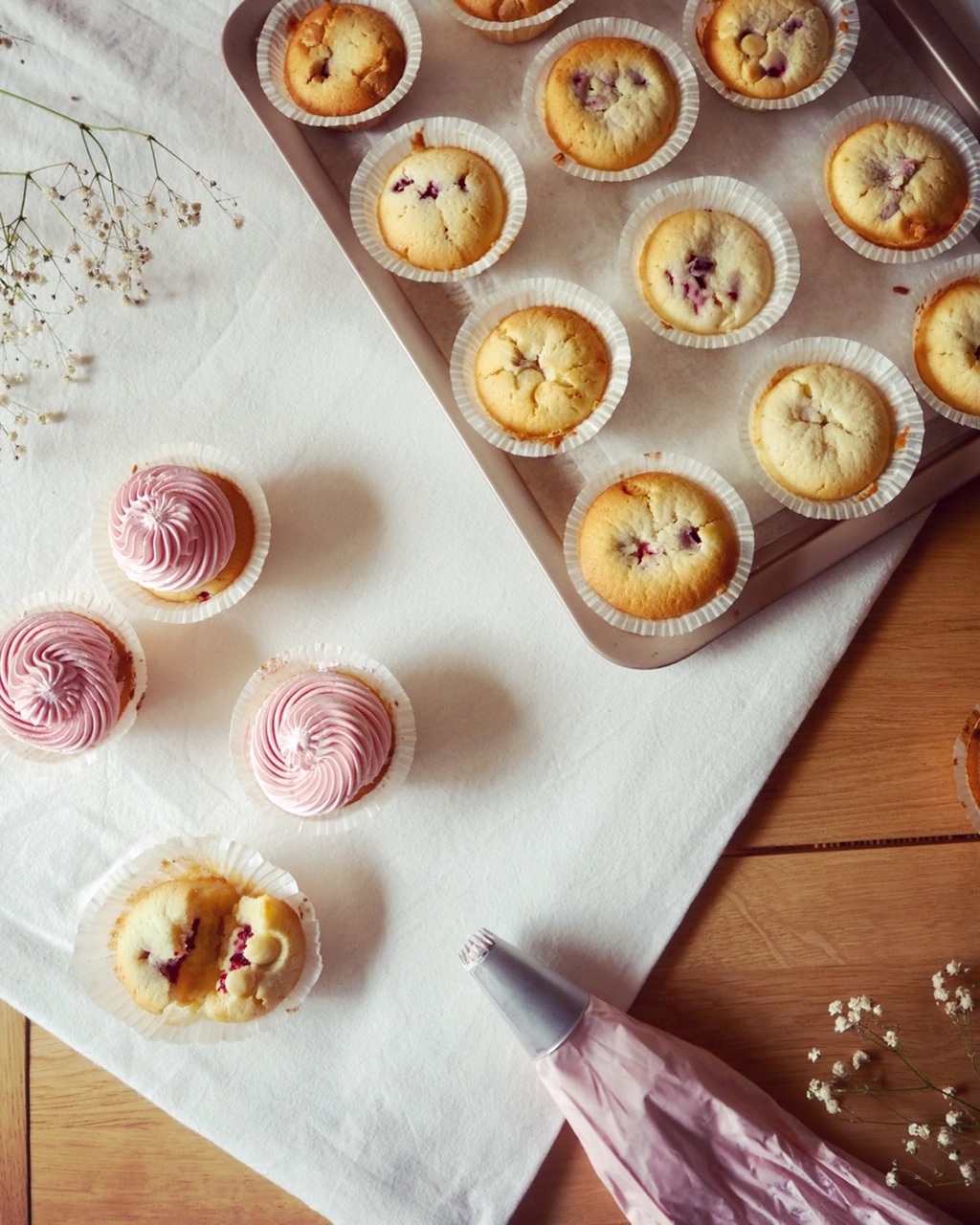 – Ajouter 3-4 framboises au centre de chaque cupcakes et enfoncer avec le doigt pour recouvrir de pâte.
