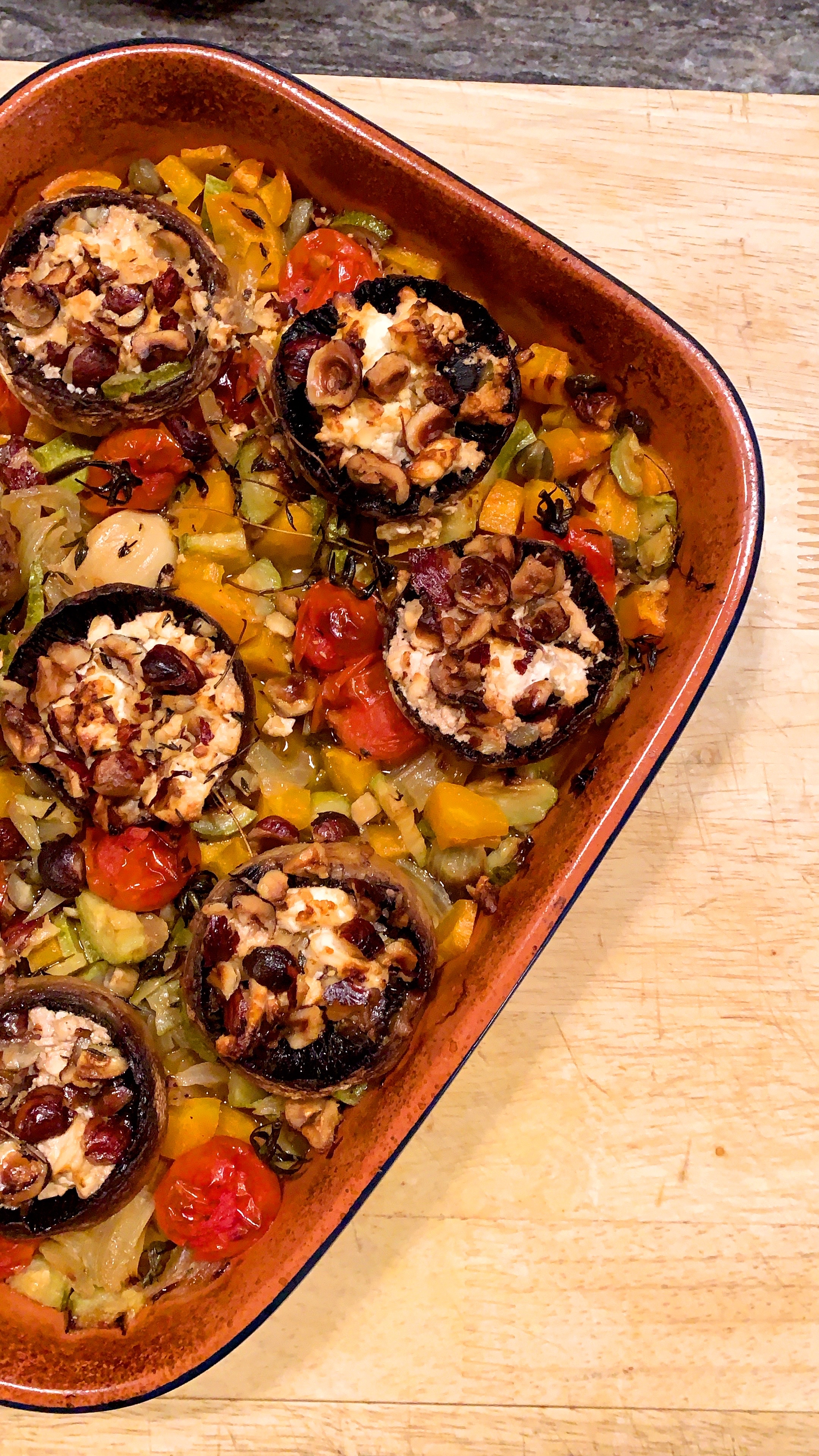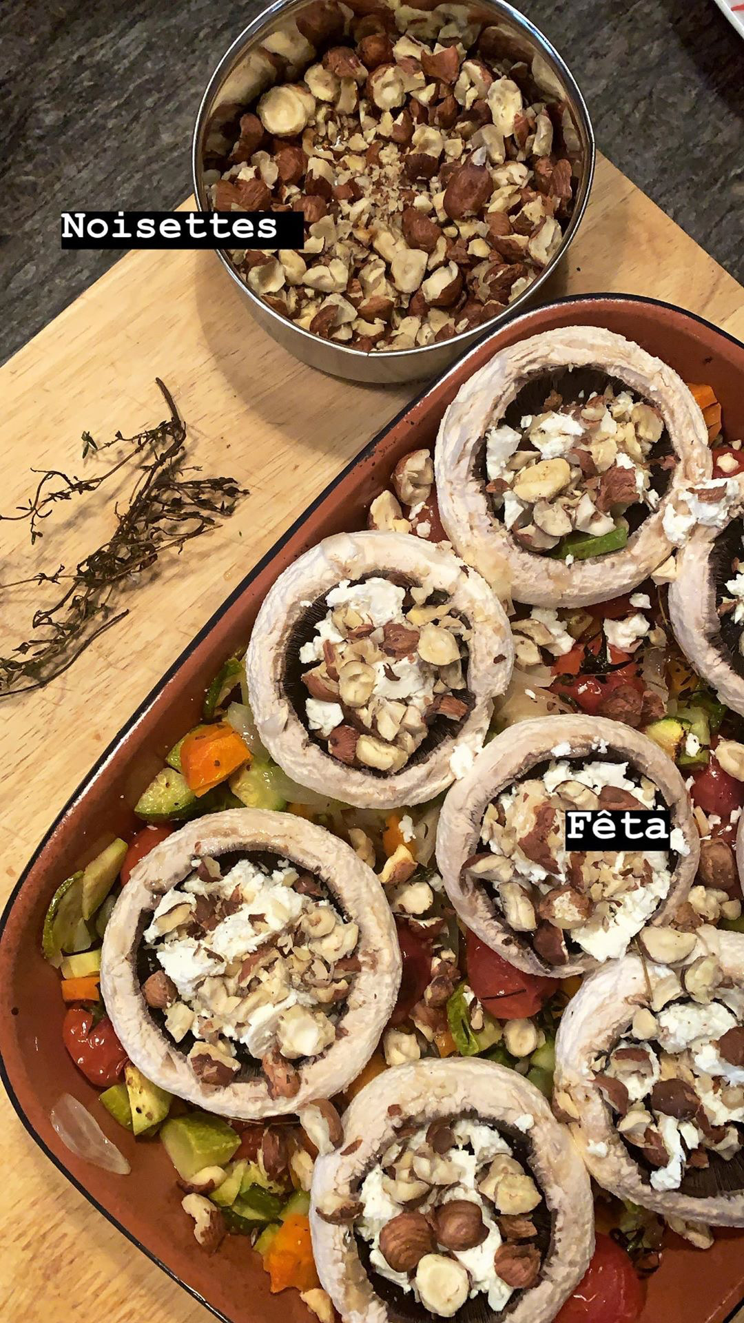 CHAMPIGNONS FARCIS, FETA, NOISETTES ET PETITS LEGUMES