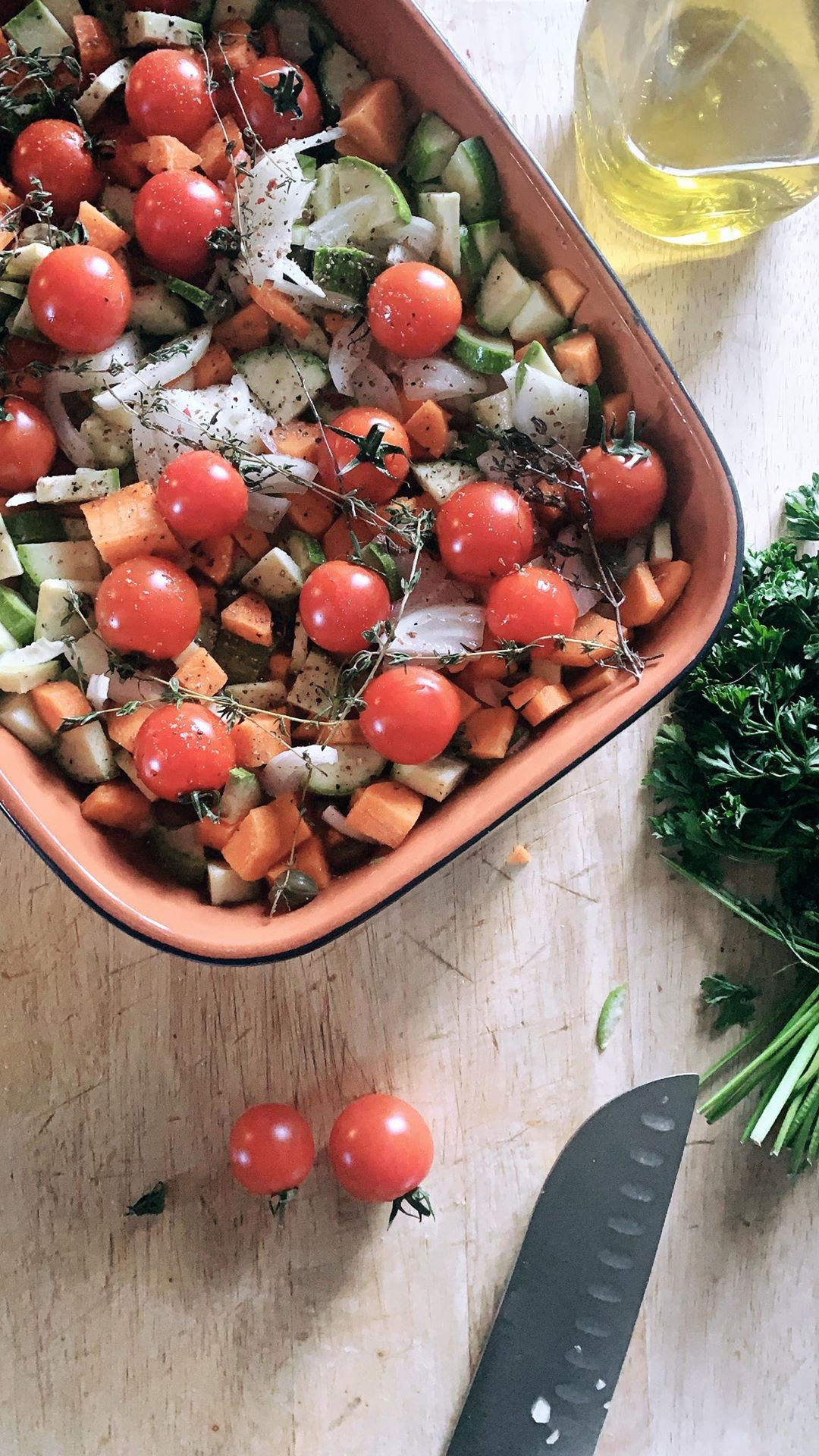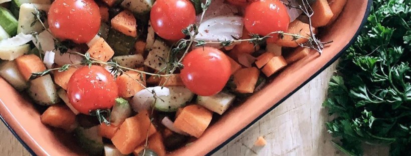 - Placer les légumes dans un grand plat à gratin, déposer les tomates cerises, la branche de thym ou herbe de provences, les gousses d’ail écrasées, arroser avec le vin et 10cl d’eau, 1CS d’huile d’olive, saler, poivrer et enfourner pour 30 min.