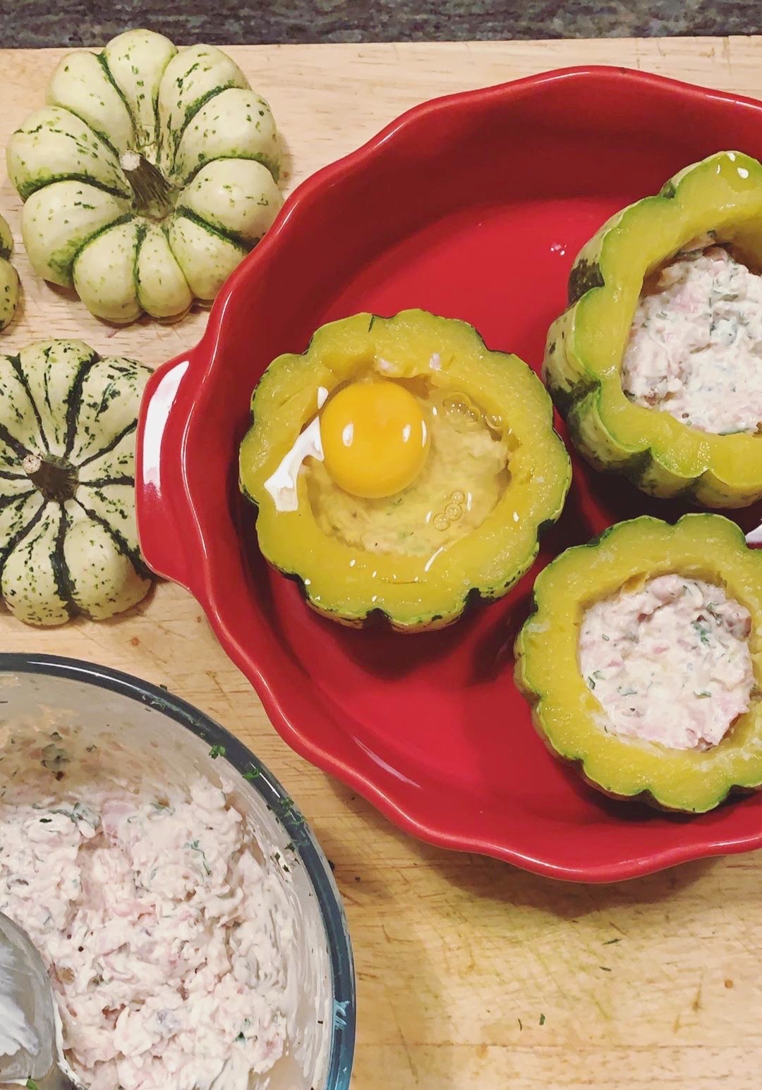 - Dans un bol mélanger le jambon, l’échalotte, le persil, la crème. Saler, poivrer. Répartir cette garniture dans le fond de chaque patidou égoutté. Casser un oeuf (attention ça déborde)