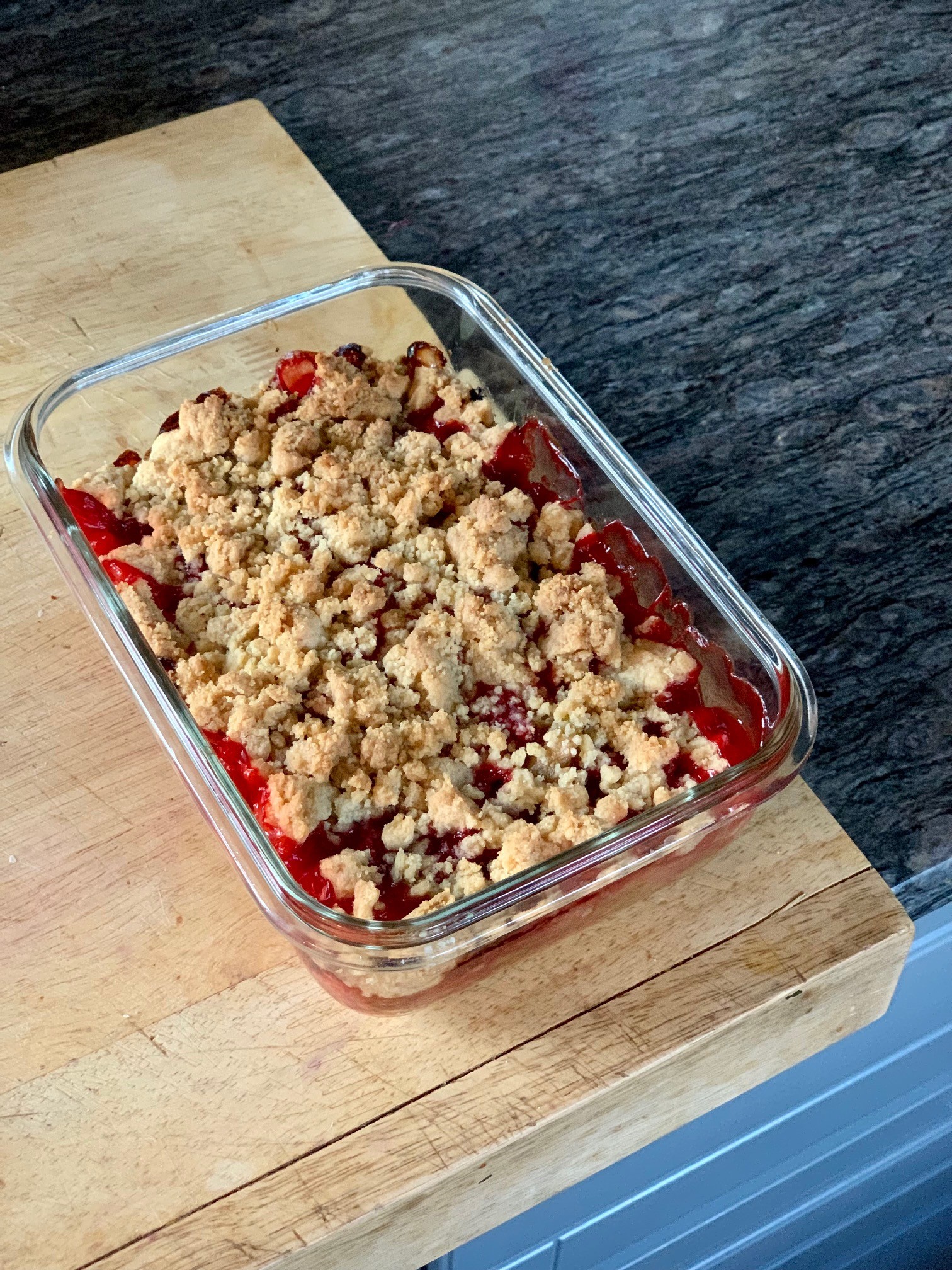 J’ai piqué l’idée de Laurent Mariotte qui mets du crumble au dessus et au dessous des fruits ! Encore plus gourmands, et moins de jus puisque la pâte absorbe le jus. Donc.