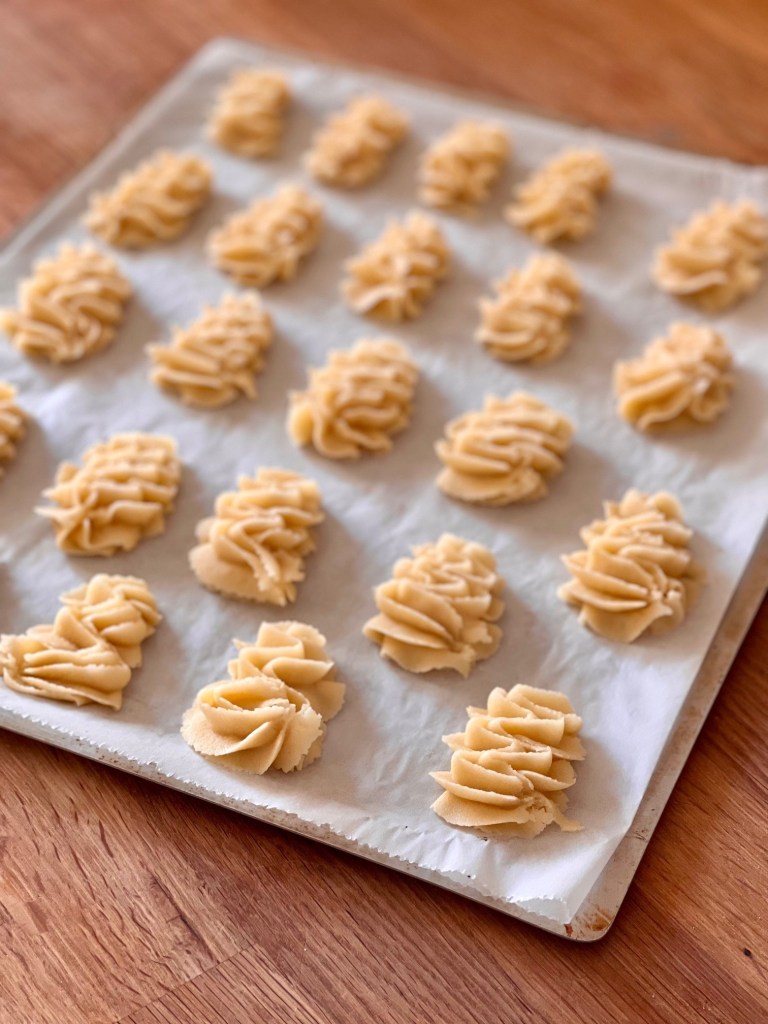 - Mettre la pâte dans une poche à douille munie d’une grosse douille cannelée, puis pocher des S ou des ronds sur une plaque recouverte de papier sulfurisé