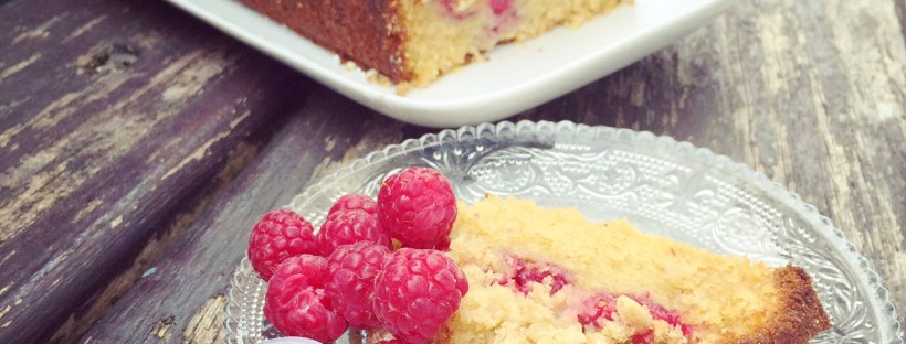 Cake gourmand, crumble, framboises, chocolat blanc.
